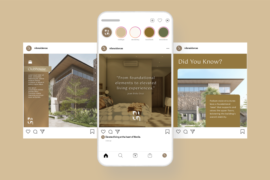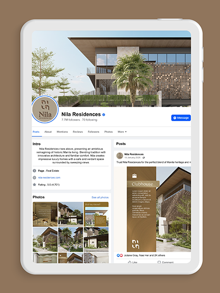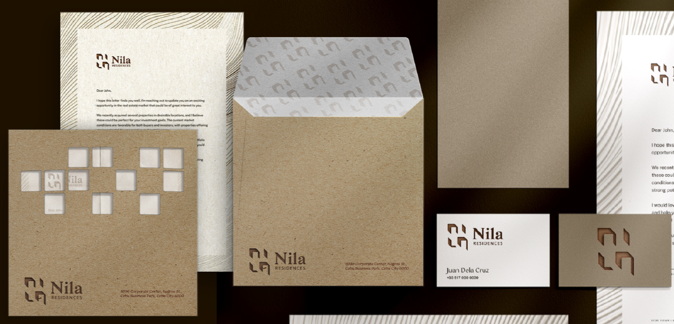 The Nila logo draws from the capiz window, an iconic feature of traditional Filipino houses, framing a vision of elevated living. From digital to print, Nila’s identity adapts with precision — ensuring consistency and recognizability across all touchpoints.